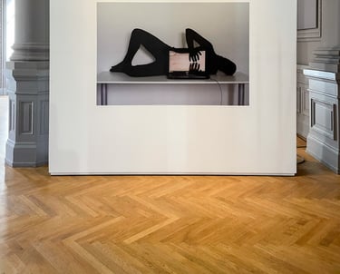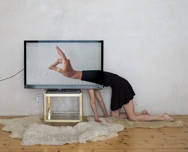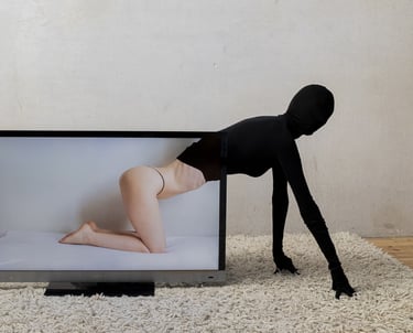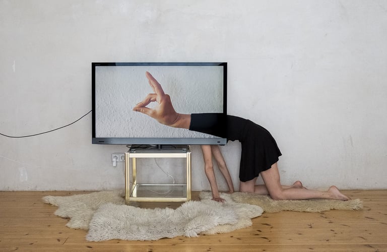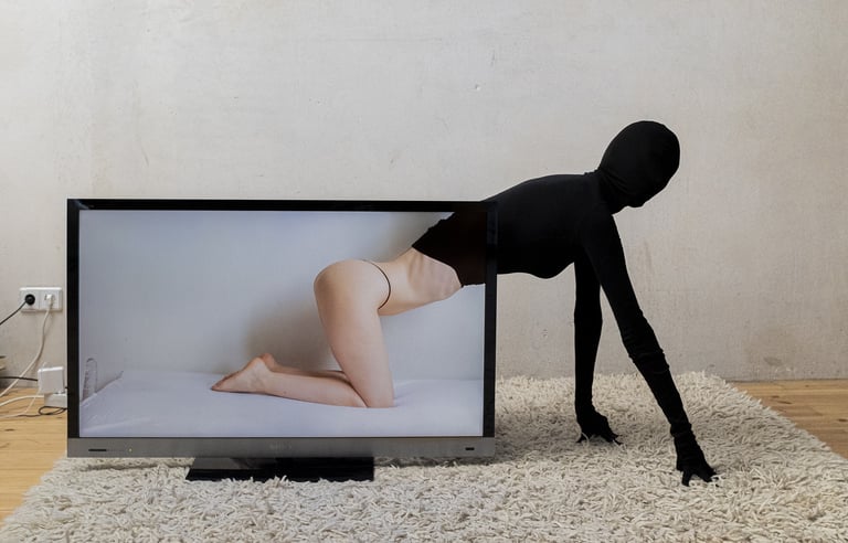 One in Berlin, the other in Zurich, they started experimenting with what keeps them together: the interface of their screens. This is how the images of the series Together A Part are born: the black surfaces of smartphones, laptops and TVs become extensions of the duo’s bodies, both practically and visually. The queer images of Red Rubber Road depict desiring bodies tending towards each other, playing and expanding with their two-dimensional prosthesis; hermaphrodites of time that harmoniously let here and there coexist, haunting us.